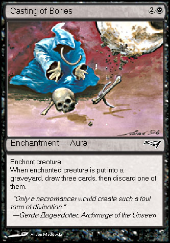 : Enchant creature When enchanted creature is put into a graveyard, draw three cards, then discard one of them.