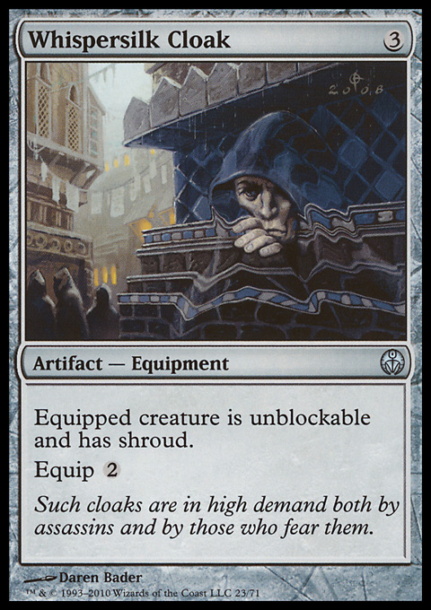 Name: Whispersilk Cloak Rarity: Uncommon Set: Duel Decks: Phyrexia vs. the Coalition [DDE] Attack: 0 Defense: 0 Cost: Type: Artifact Sub-Type: Equipment Rules: Equipped creature is unblockable and can't be the target of spells or abilities. Equip 2 (2: Attach to target creature you control. Equip only as a sorcery. This card comes into play unattached and stays in play if the creature leaves play.) Price: 0.30