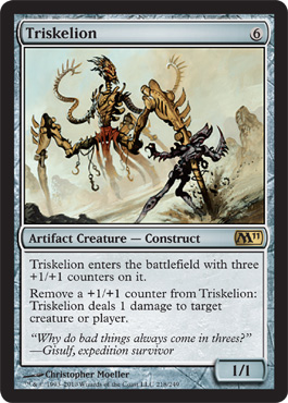 Name: Triskelion Rarity: Rare Set: Magic 2011 [M11] Attack: 1 Defense: 1 Cost: Type: Artifact Creature Sub-Type: Rules: Triskelion comes into play with three +1/+1 counters on it. Remove a +1/+1 counter from Triskelion: Triskelion deals 1 damage to target creature or player. Price: 0.02