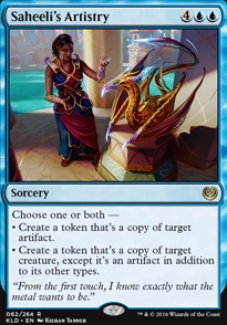 Name: Saheeli's Artistry Rarity: Rare Set: Kaladesh [KLD] Attack: 0 Defense: 0 Cost: Type: Sorcery Sub-Type: Rules: Choose one or both -£• Create a token that's a copy of target artifact.£• Create a token that's a copy of target creature, except it's an artifact in addition to its other types. Price: 0.02