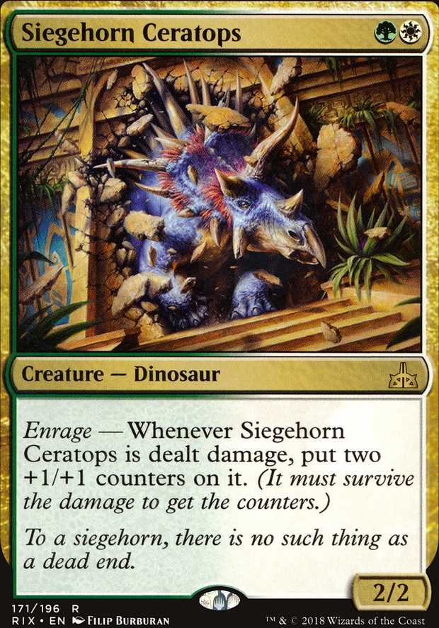 Name: Siegehorn Ceratops Rarity: Rare Set: Rivals of Ixalan [RIX] Attack: 2 Defense: 2 Cost: Type: Creature - Dinosaur Sub-Type: Rules: Enrage - Whenever Siegehorn Ceratops is dealt damage, put two +1/+1 counters on it. #(It must survive the damage to get the counters.)# Price: 0.02