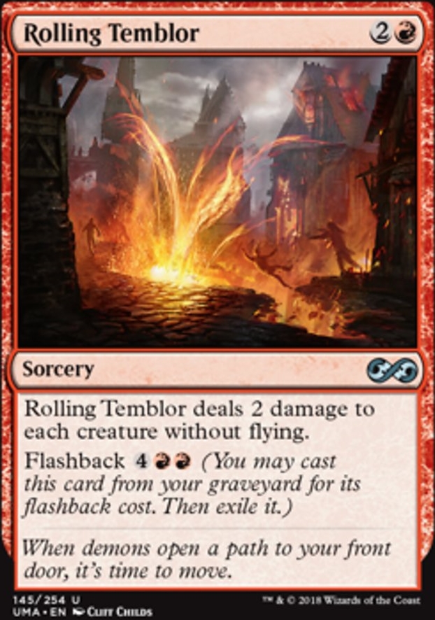 Name: Rolling Temblor Rarity: Uncommon Set: Ultimate Masters [UMA] Attack: 0 Defense: 0 Cost: Type: Sorcery Sub-Type: Rules: Rolling Temblor deals 2 damage to each creature without flying. Flashback {4}{R}{R} (You may cast this card from your graveyard for its flashback cost. Then exile it.) Price: 0.04
