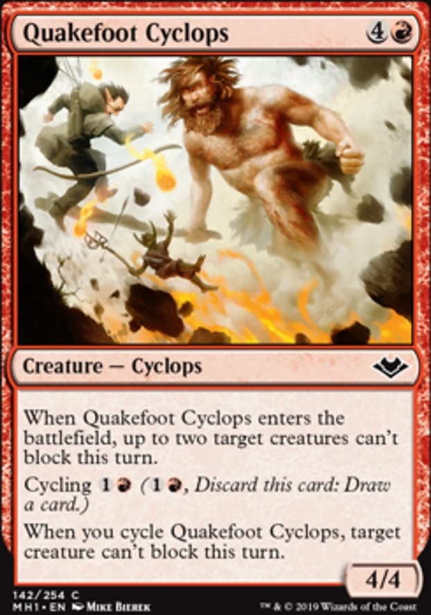 Name: Quakefoot Cyclops Rarity: Common Set: Modern Horizons [MH1] Attack: 4 Defense: 4 Cost: Type: Creature - Cyclops Sub-Type: Rules: When Quakefoot Cyclops enters the battlefield, up to two target creatures can't block this turn.Cycling {1}{R} #({1}{R}, Discard this card: Draw a card.)#When you cycle Quakefoot Cyclops, target creature can't block this turn. Price: 0.02