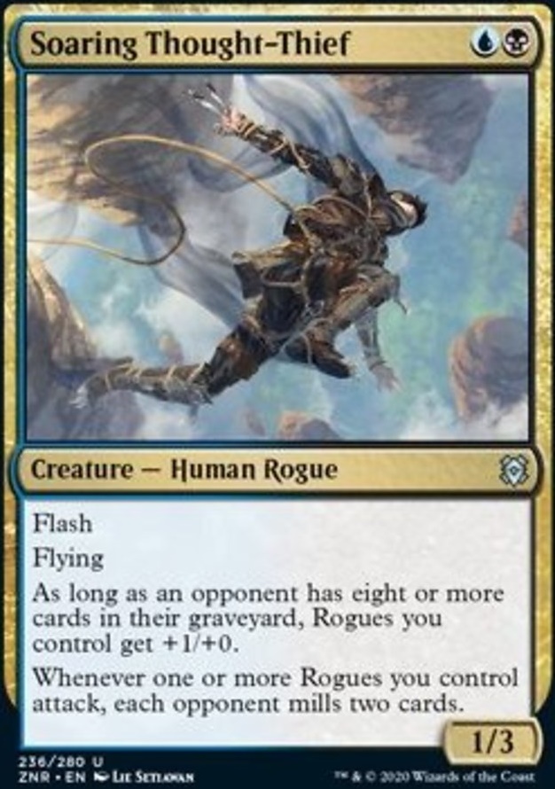 Name: Soaring Thought-Thief Rarity: Uncommon Set: Zendikar Rising [ZNR] Attack: 1 Defense: 3 Cost: Type: Creature - Human Rogue Sub-Type: Rules: Flash Flying As long as an opponent has eight or more cards in their graveyard, Rogues you control get +1/+0. Whenever one or more Rogues you control attack, each opponent mills two cards. Price: 0.02