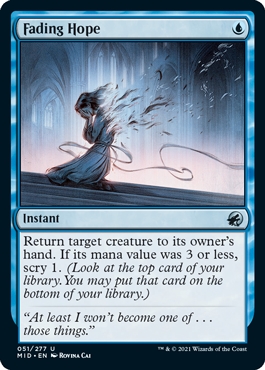 Name: Fading Hope Rarity: Uncommon Set: Innistrad: Midnight Hunt [MID] Attack: 0 Defense: 0 Cost: Type: Instant Sub-Type: Rules: Return target creature to its owner's hand. If its mana value was 3 or less, scry 1. #(Look at the top card of your library. You may put that card on the bottom of your library.)# Price: 0.03