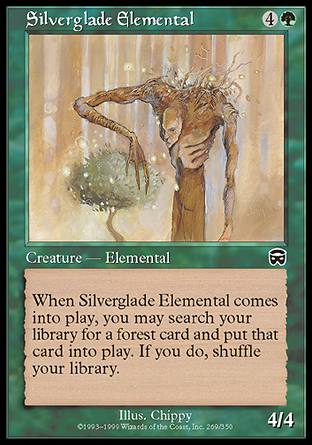 Name: Silverglade Elemental Rarity: Common Set: Mercadian Masques [MM] Attack: 4 Defense: 4 Cost: Type: Creature Sub-Type: Elemental Rules: When Silverglade Elemental comes into play, you may search your library for a Forest card and put that card into play. If you do, shuffle your library. Price: 0.04