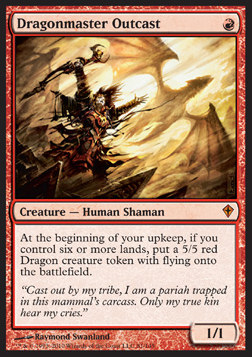 Name: Dragonmaster Outcast Rarity: Mythic Set: Worldwake [WWK] Attack: 0 Defense: 1 Cost: Type: Creature — Human Shaman Sub-Type: Rules: At the beginning of your upkeep, if you control six or more lands, put a 5/5 red Dragon creature token with flying onto the battlefield. Price: 0.02