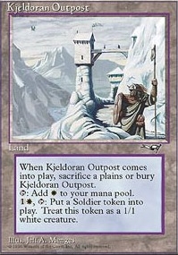 Name: Kjeldoran Outpost Rarity: Rare Set: Vintage Masters [VMA] Attack: 0 Defense: 0 Cost: Type: Land Sub-Type: Rules: If Kjeldoran Outpost would come into play, sacrifice a Plains instead. If you do, put Kjeldoran Outpost into play. If you don't, put it into its owner's graveyard. T Add W to your mana pool. 1W, T Put a 1/1 white Soldier creature token into play. Price: 0.02