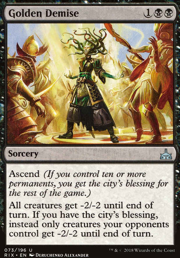 Name: Golden Demise Rarity: Uncommon Set: Rivals of Ixalan [RIX] Attack: 0 Defense: 0 Cost: Type: Sorcery Sub-Type: Rules: Ascend #(If you control ten or more permanents, you get the city's blessing for the rest of the game.)#ВЈAll creatures get -2/-2 until end of turn. If you have the city's blessing, instead only creatures your opponents control get -2/-2 until end of turn. Price: 0.03